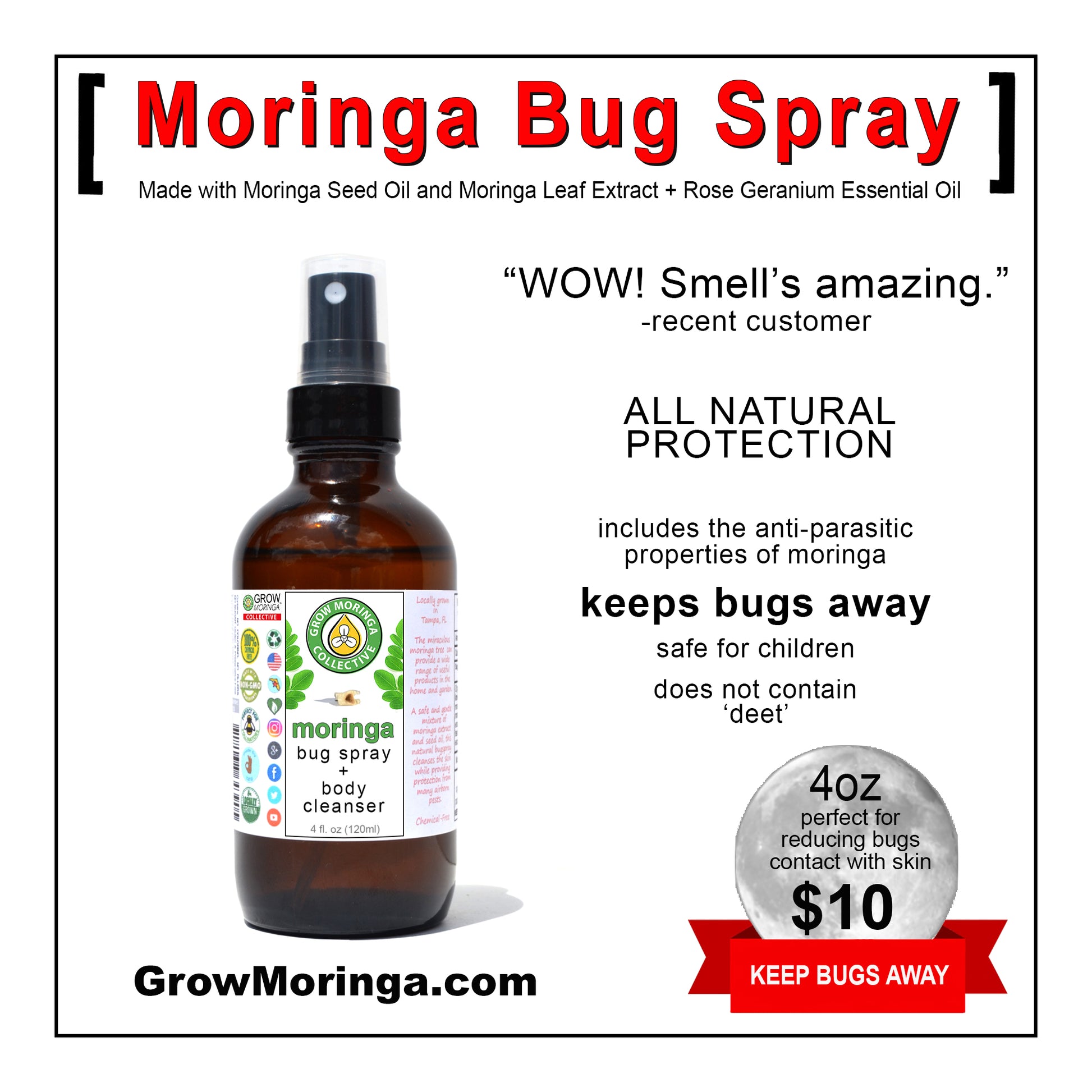 Moringa Bug Spray contains Moringa Seed Oil, Moringa Leaf Extract and Distilled Water. Additional Ingredients Included, Essential Oils: Rose Geranium, Tea Tree, Lavender, Eucalyptus and Lemongrass.